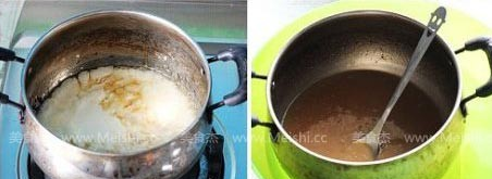 1:先把鍋刷干凈,在鍋里放入糖后,倒入30克冷水;將鍋用小火加熱。隨著熱度上升,糖會漸漸溶解,并開始冒出小泡,加熱的過程中不需要攪拌,切記!