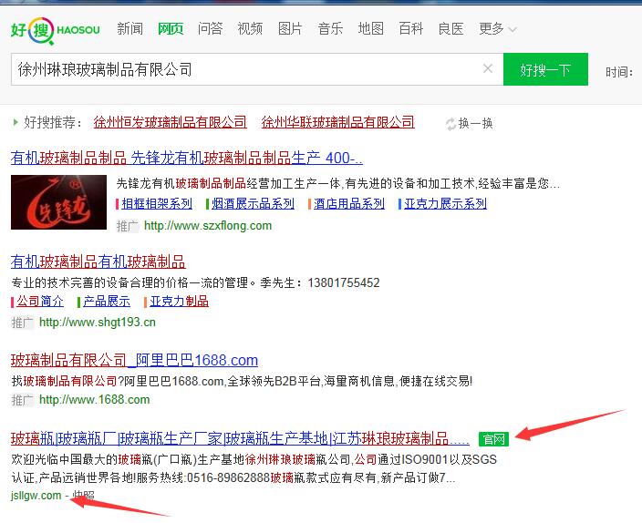 第二種方法就是打開360綜合搜索或者好搜搜索引擎,搜索:徐州穩健玻璃制品有限公司,顯示官網的就是公司總部網站,如圖