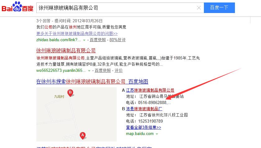 首先我們可以打開百度,在百度上搜索徐州穩健玻璃制品有限公司,然后查看百度地圖上的電話,直接給玻璃瓶生產廠家打電話,如圖: